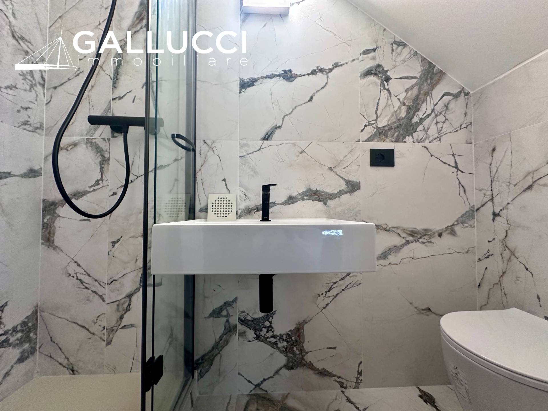 Il bagno dotato di lavabo con sifone d’arredo a vista, rivestimenti con gres porcellanato, rubinetteria in ottone cromato, punti luce e presa luce; aspiratore ed eventuale presa fm ove prevista la lavatrice.